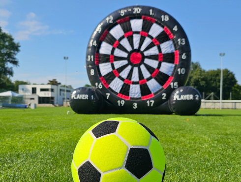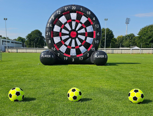 Treffsicherheit trifft Ballgefühl! Zwei Spieler treten im 1-gegen-1-Modus an und zielen mit Klett-Fußbällen auf die übergroße Dartscheibe – ein actionreicher Spaß für jedes Event!