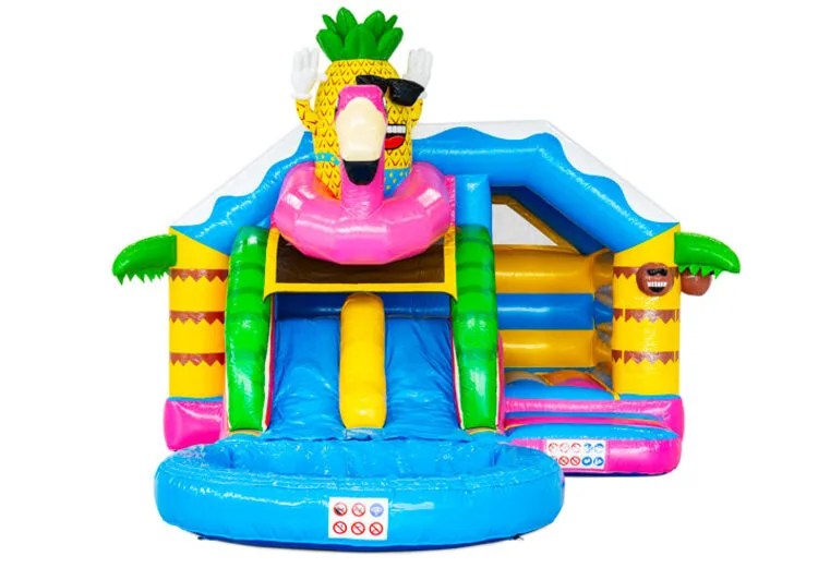 Hüpfen und Rutschen in einem! Gemeinsam mit der riesigen Ananas die Rutsche hinuntergleiten – die Slide Combo „Hawaii Flamingo“ bietet alles für stundenlangen Spielspaß. Einsteigen, hüpfen und direkt vom Rutschspaß ins Becken sausen